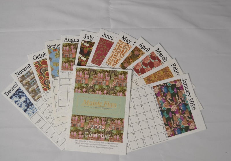 Maisie Finn is a specialist in surface pattern design. Each month in therse Calendars has an image of one of Maisie's original designs. With the planet in mind, the calendars are mde on Wildflower Seed Paper.